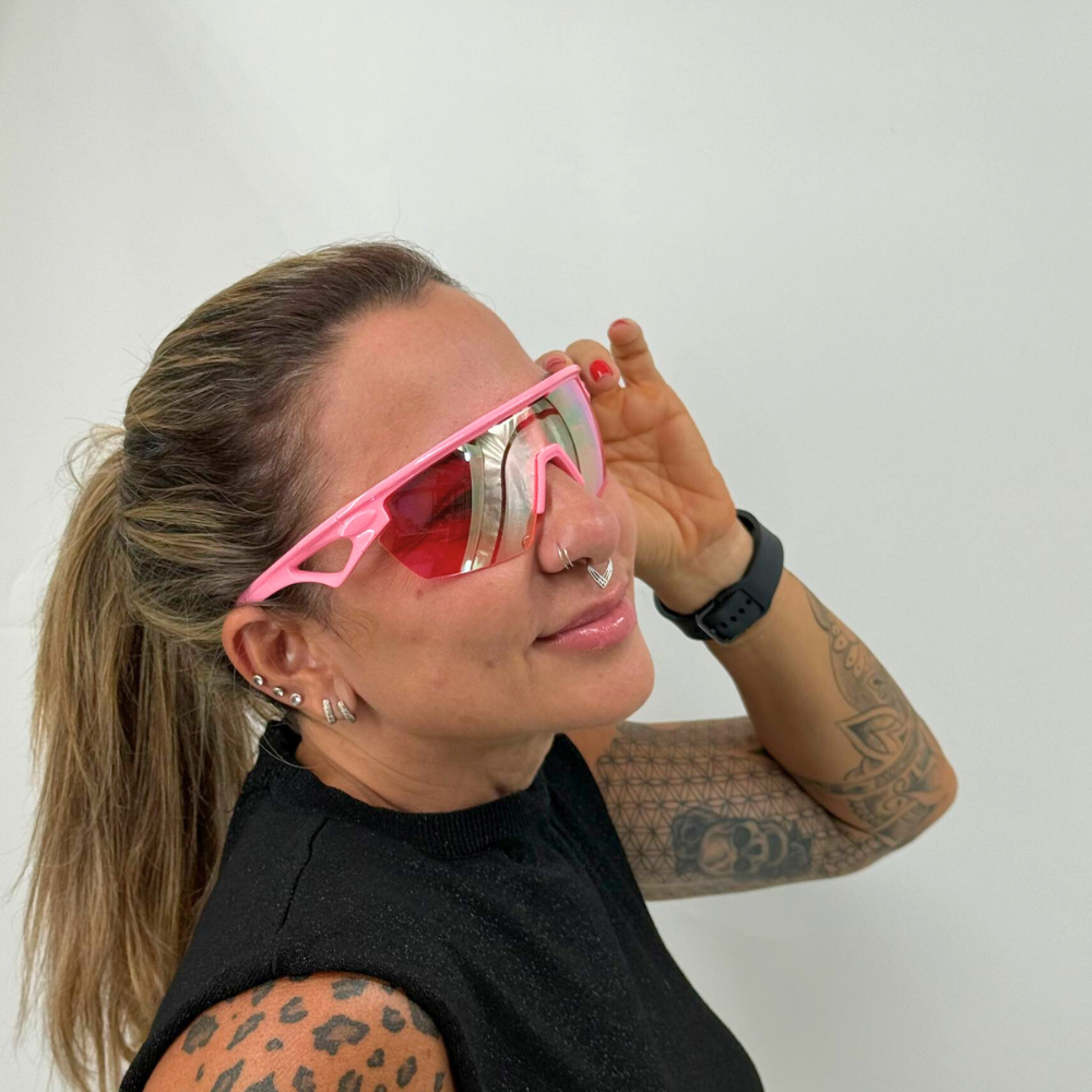 A armação leve e confortável se adapta bem ao rosto, proporcionando estabilidade durante pedaladas, corridas ou treinos, além de dar um visual marcante com a combinação do rosa vibrante e lente refletiva.
